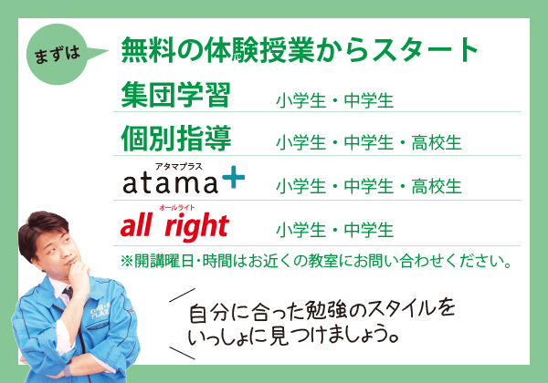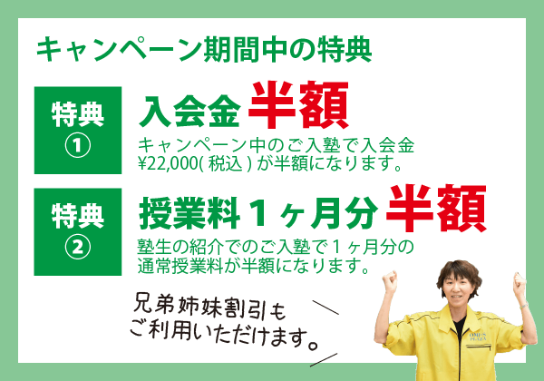 青葉キャンペーン 2024-05-06 夏に向かって、学力の枝葉をぐんぐん伸ばそう。 期間 2024年5月6日 (月) ~ 2024年6月22日 (土) 対象学年 小1~高3 お問い合わせ お問い合わせフォーム、お電話、または、お近くの教室までご連絡ください。