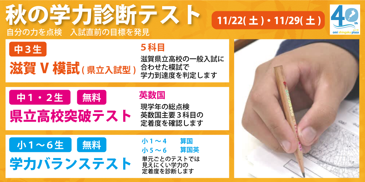 秋の学力診断テストのお知らせ 2025-10-28 自分の力を点検入試直前の目標を発見! 滋賀V模試(県立入試型) 中3生・5科目 県立高校突破テスト 中1・2生・英数国受験料無料 学力バランステスト 小1~4生・算国小5~6生・算国英受験料無料 ■ 開催教室 ・南草津第Ⅰ教室・南草津第Ⅱ教室・守山教室・膳所教室・八幡桜宮教室 ■ 日時 11月22日(土)・11月29日(土)時間・日程はご相談ください ■ お問い合わせ お問い合わせフォーム、お電話、または、お近くの教室までご連絡ください。