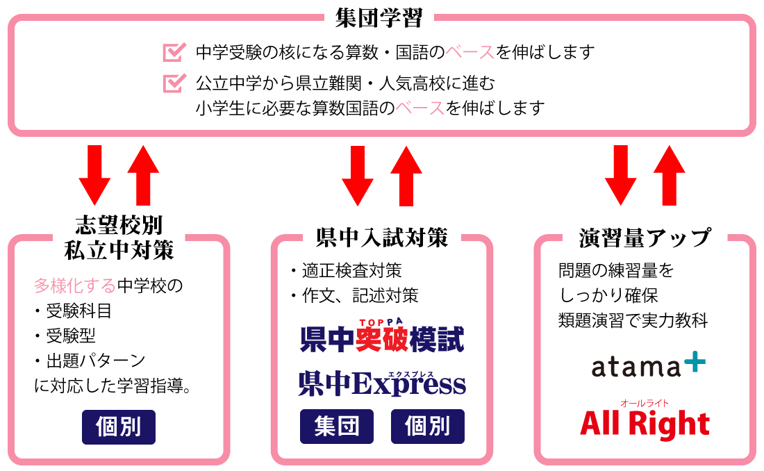 滋賀ローカル塾ならではの、各中学別の受験科目・出題パターンに対応した学習指導で、