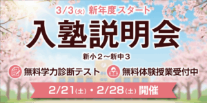 新しい学年の第一歩を応援します!新学年応援キャンペーン キャンペーン中の特典 ■ 特典1 入会金半額 キャンペーン中のご入塾で入会金¥22,000(税込)が半額になります。 ■ 特典2 授業料1ヶ月分半額 塾生の紹介での […]