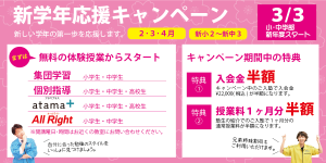新しい学年の第一歩を応援します!新学年応援キャンペーン キャンペーン中の特典 ■ 特典1 入会金半額 キャンペーン中のご入塾で入会金¥22,000(税込)が半額になります。 ■ 特典2 授業料1ヶ月分半額 塾生の紹介での […]