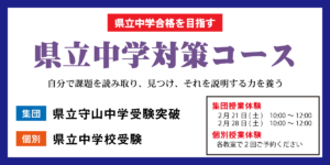 県立中学校を目指す小学生を徹底応援します。 県立中学校を目指す小5・6生対象選抜コース開講。3月より体験学習受付中。 思考力・判断力・表現力を見る県立中入試タイプの問題は、学力の柱を鍛えるにはうってつけ。県立中合格に向け […]